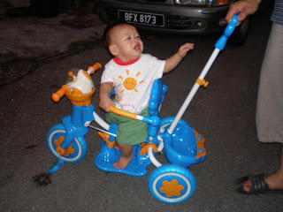 This tricycle can be maneuvered from the back panel. And since his legs are so short, cannot reach the paddle..so can rest on tray where you can remove the tray when he is bigger and taller and when he can ride the tricycle on his own. What i like most about this was the safety railings around him. When he stable enough to ride on his own you can lift the railing up. And we bought a car - baby chair for him la. Actually we wanted the cover only coz we have good one at home but the cover is spoilt la. And the cover outside in the market is about RM199. So buy this chair to take the skin only.